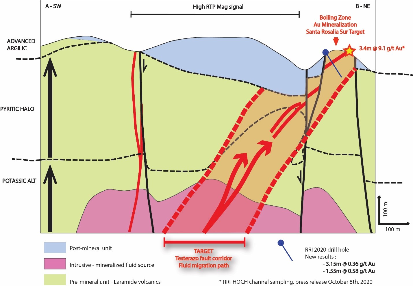 - Detailed and regional mapping by Riverside defines post-mineral cover boundary which was previously interpreted as the limit of the system and is now clearly seen as younger cover with the system being significantly larger and only a fraction exposed at the surface. Channel rock-sampling highlighting up to 3.4m @ 9.1 g/t Au at the surface of the single drill hole demonstrates potential for more gold in further drilling of this Santa Rosalia Sur target.