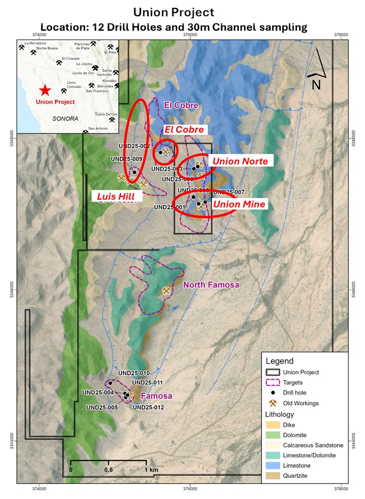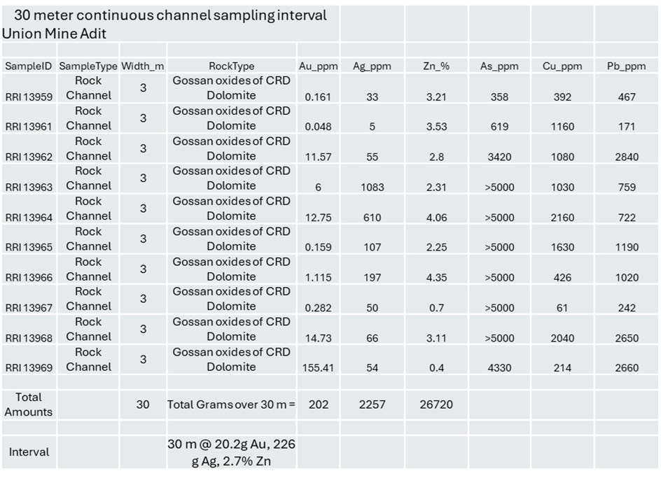 "Riverside is excited by the high grade of 30 meters chip-channel sampling within the oxidized upper part of the Union Mine," said John-Mark Staude, President and CEO of Riverside Resources. "These results, together with the completed Phase 1 drill assays from Union Mine, Union Norte and El Cobre, reinforce that drilling is intersecting the types of CRD-style alteration and multi-element signatures we were targeting, including anomalous zinc, silver, gold and lead consistent with the historic mining district and also finding sediment-hosted gold ("SHGD") indicators is a key development in progressing the Union Project and now we are ready for follow-up drilling in 2026."