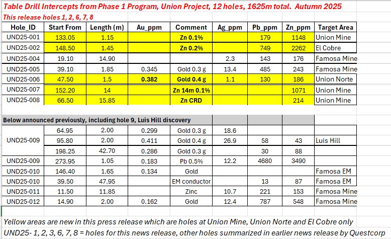 Table 2: Summary of selected Phase 1 Drill program mineralized intercepts with true widths not known due to folding, faulting, and the early nature of this first phase of drilling. The yellow highlights are the new results for this news release, which were not previously announced by Questcorp.