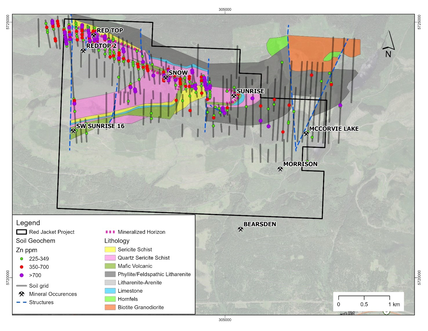 The historical geochemistry, geology and geophysics, including that on the optioned claims, continues to add value for the Company. This builds on key work completed by companies such as Placer Dome, and precedes the work by Taseko, which now controls the large copper resource, reserve and feasibility-staged property to the south. At Red Jacket, the combined and integrated historical soil sampling surveys confirm the continuity of the known mineralized bands, and can be traced consistently within a defined belt over 4km long northwest-southeast horizon that includes the known MinFile showings: Redtop, Snow and Sunrise (Figure 2). The prospective horizon hosting these showings has received minimal drill testing and the entire length of the horizon is considered a target. Historical work by Placer Dome Inc. shows a zinc-in-soil anomaly enveloping the areas of known mineralization, similar to the Yellowhead deposit in its early exploration history. This linear, southeast trending anomaly is roughly parallel to a potassium enrichment zone shown in the K% and eTH/eK radiometric images (Figure 1). In addition, the north-trending linear magnetic highs noted on the Total Magnetic Intensity image are likely showing mafic dikes and/or structures. Together, the airborne detailed magnetics help in refining targets, and the coincident soil anomalies provide immediate areas of interest with district-scale potential. Linking the historical showings with the consolidated land package positions the Company to advance systematic work aimed at unlocking value for shareholders.