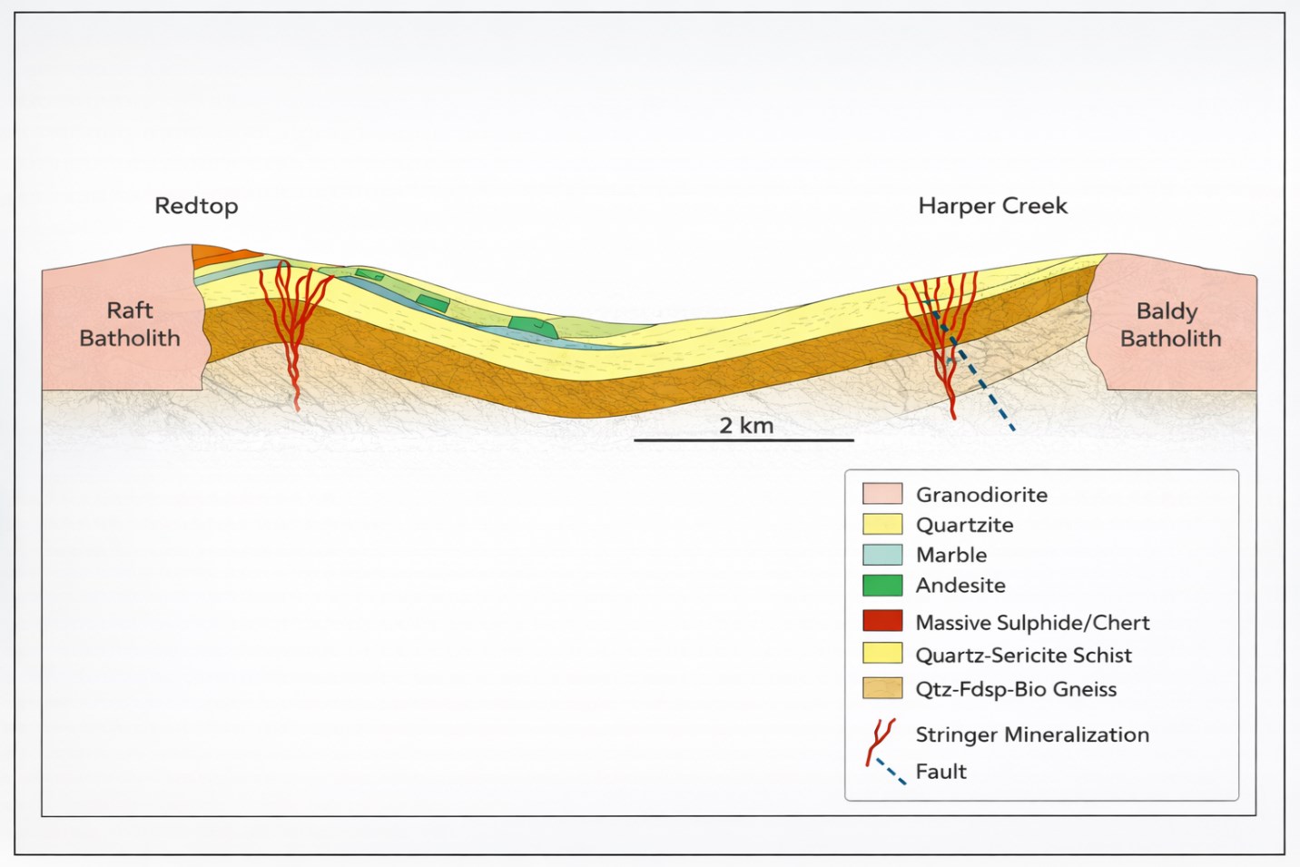 The Harper Creek deposit, 10 km to the southeast, is part of the Eagle Bay Formation's metavolcanic and metasedimentary rocks. Geologically, it lies on the western margin of the Omineca Belt within the Kootenay Terrane. The mineralization is found within tabular zones in various phyllites and quartzites, including quartz-sericite, chloritic, carbonaceous phyllite, and sericitic quartzite. Mineralization occurs as disseminations and patches along rock foliations, and within quartz and quartz-carbonate veins. It is associated with minor sphalerite, galena, arsenopyrite, molybdenite, tetrahedrite-tennantite, bornite, and cubanite, with occurrences of magnetite.